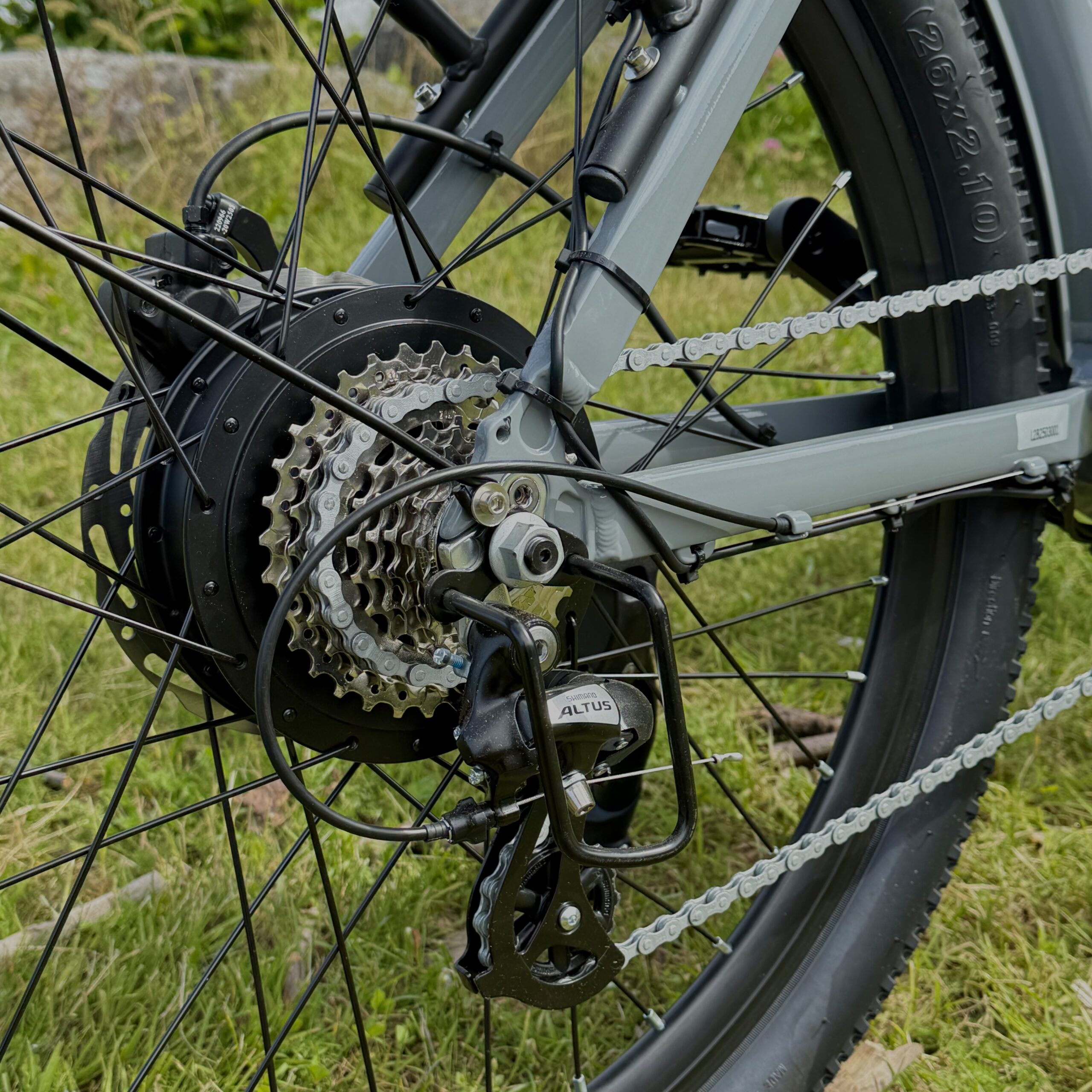 Cykelns design inkluderar stötdämpare i framgaffeln, vilket bidrar till en smidigare och mer behaglig körupplevelse även på ojämna underlag. Shimano ALTUS 8 växlar ger dig möjlighet att anpassa cyklingen efter olika vägförhållanden utan att kompromissa med komforten.