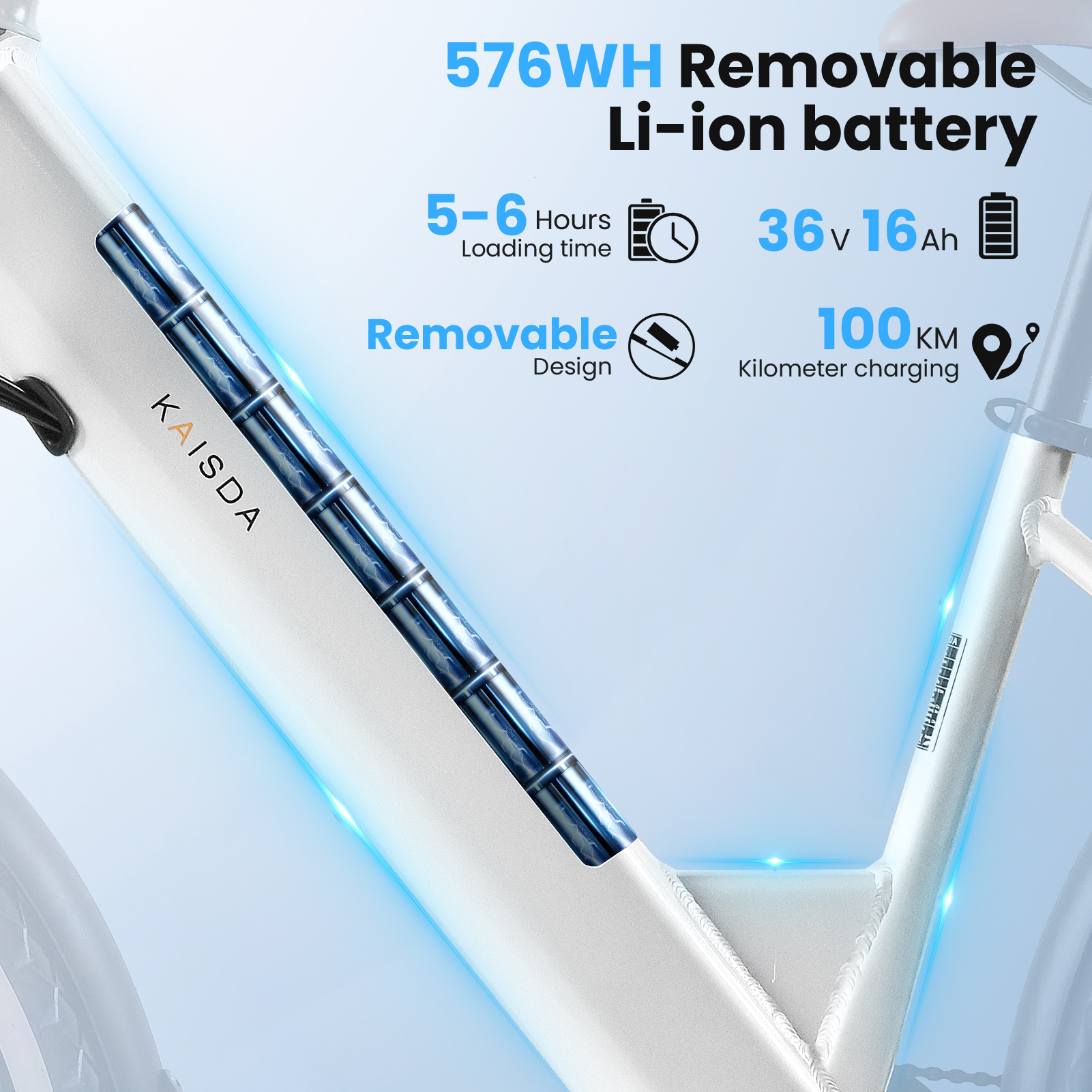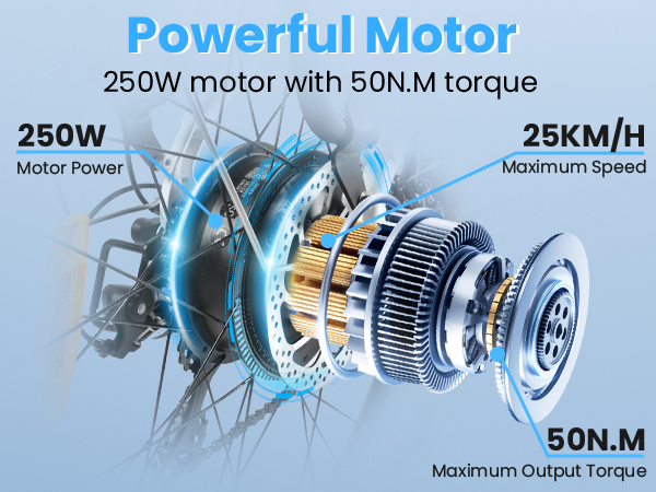 Den kraftfulla 250W bakhjulsmotorn med 55Nm i vridmoment ger stark acceleration med pedalsensor, och tumgas ingår för extra bekvämlighet. Cykeln når upp till 25 km/h och är utrustad med 36V/16Ah avtagbart batteri med A-klassade celler – vilket ger en räckvidd på upp till 60 km.