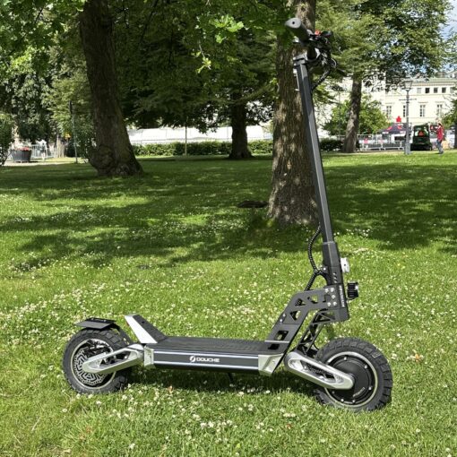 Elsparkcykel DOUCHE SPEAR – En imponerande maskin med dubbla motorer. Kraften är mycket stark och du svävar fram utan ansträngning. Uppförsbackar är en enkel match med dubbla motorer. Bromskraften är suveränt bra med hydrauliska bromsar. Designen är urläcker och väcker uppmärksamhet.